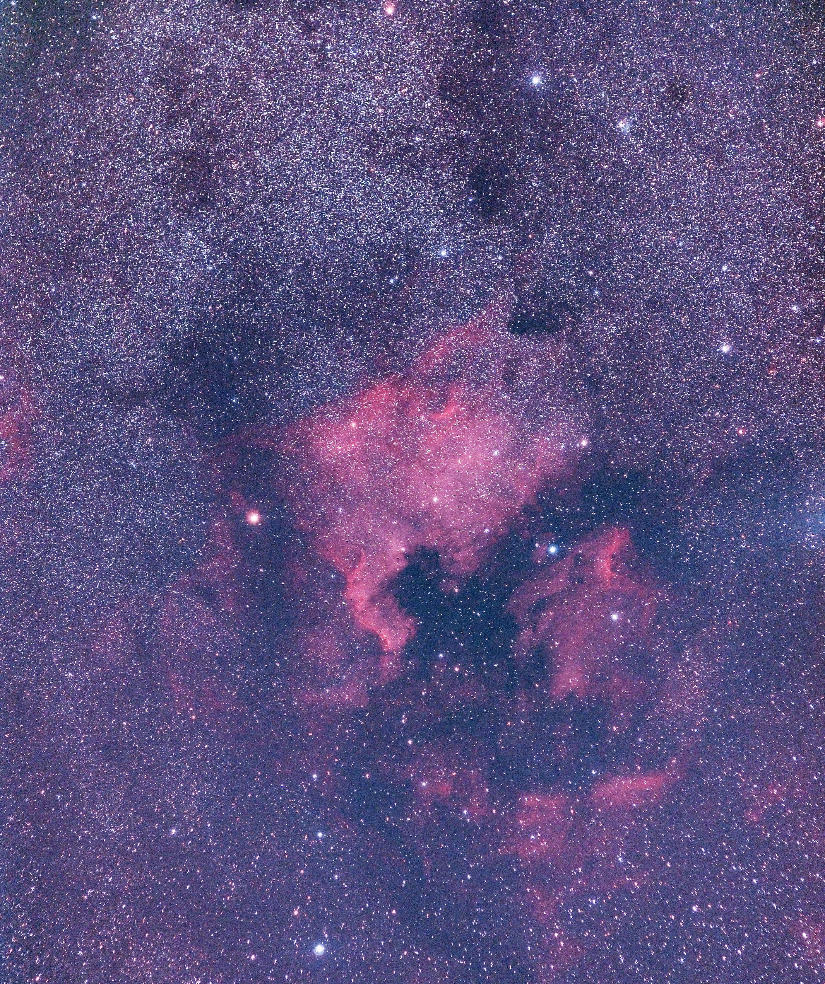 Situé entre 1600 et 2000 a.l. de nous, la grande nébuleuse en émission portant le numéro 7000 au New General Catalogue de Dreyer se trouve dans le Cygne, à environ 3° de la brillante étoile Deneb (magnitude 1,25). Le complexe de gaz d'hydrogène excité s'étend dans le ciel sur environ 3 par 2°, et la structure principale est surnommée "Amérique du Nord " en raison de sa forme. Des nuages sombres situés entre elle et la Terre semblent la sculpter, et la partie ressemblant au Mexique, appelée "Mur du Cygne", représente la région la plus active en naissance d'étoiles. On peut remarquer également à coté une grande zone écarlate évoquant un Pélican, d'où son surnom.