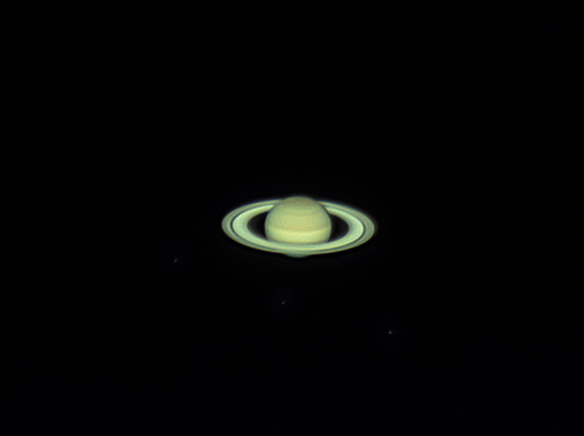 Saturne avec 3 satellites de gauche à droite Téthys, Dioné et Réa faite le 4/7/20 à 3h30 au C8 avec ASI224, adc Zwo et barlow 2x.