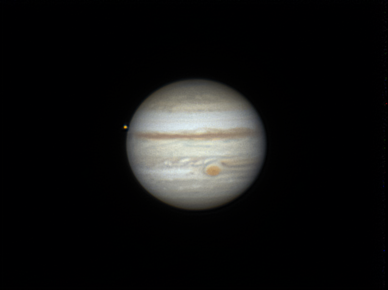 Jupiter, la grande tache rouge et Io qui sort aprés son passage derriére Jupiter.