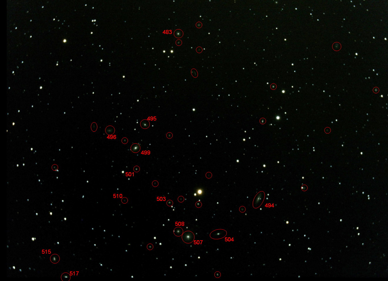Situé à 3° au nord-est de M33, ce groupe de galaxies contient 13 galaxies répertoriées au catalogue NGC. Il apparaît en fait au moins 34 membres sur cette photo.