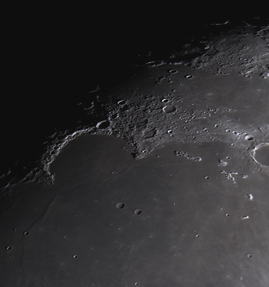 Mare Imbrium occupe le sud de la photo avec deux cratères isolés, Hélicon (à gauche) et le Verrier (à droite). La chaine arrondie de Montes Jura délimite Sinus Iridum (le Le golfe des Iris) où s'est posé le lapin de Jade chinois.
