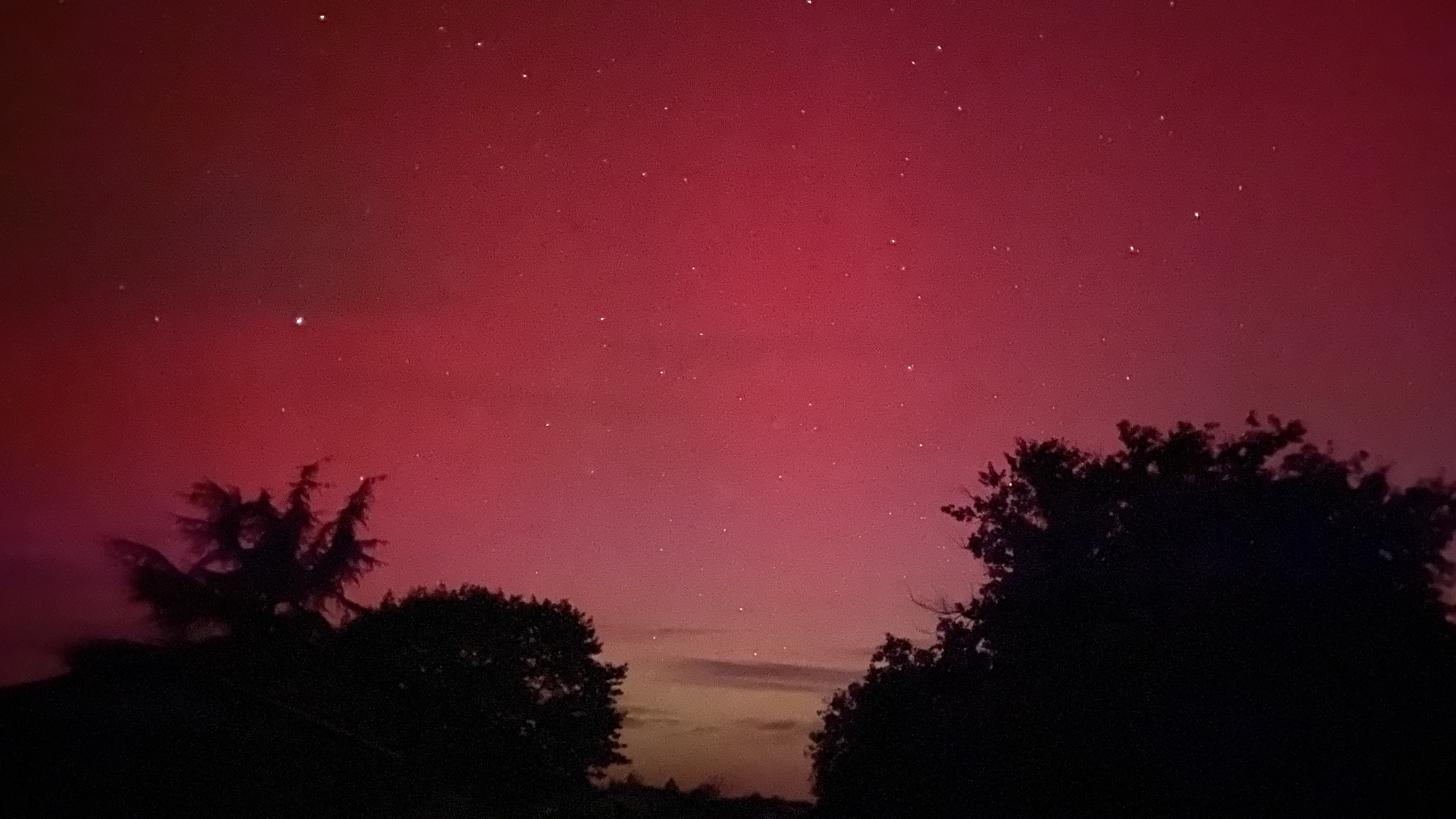 Couleur incroyablement intense, largement visible à l’œil nu mais peu de draperie contrairement à l’aurore du 11 mai dernier.
