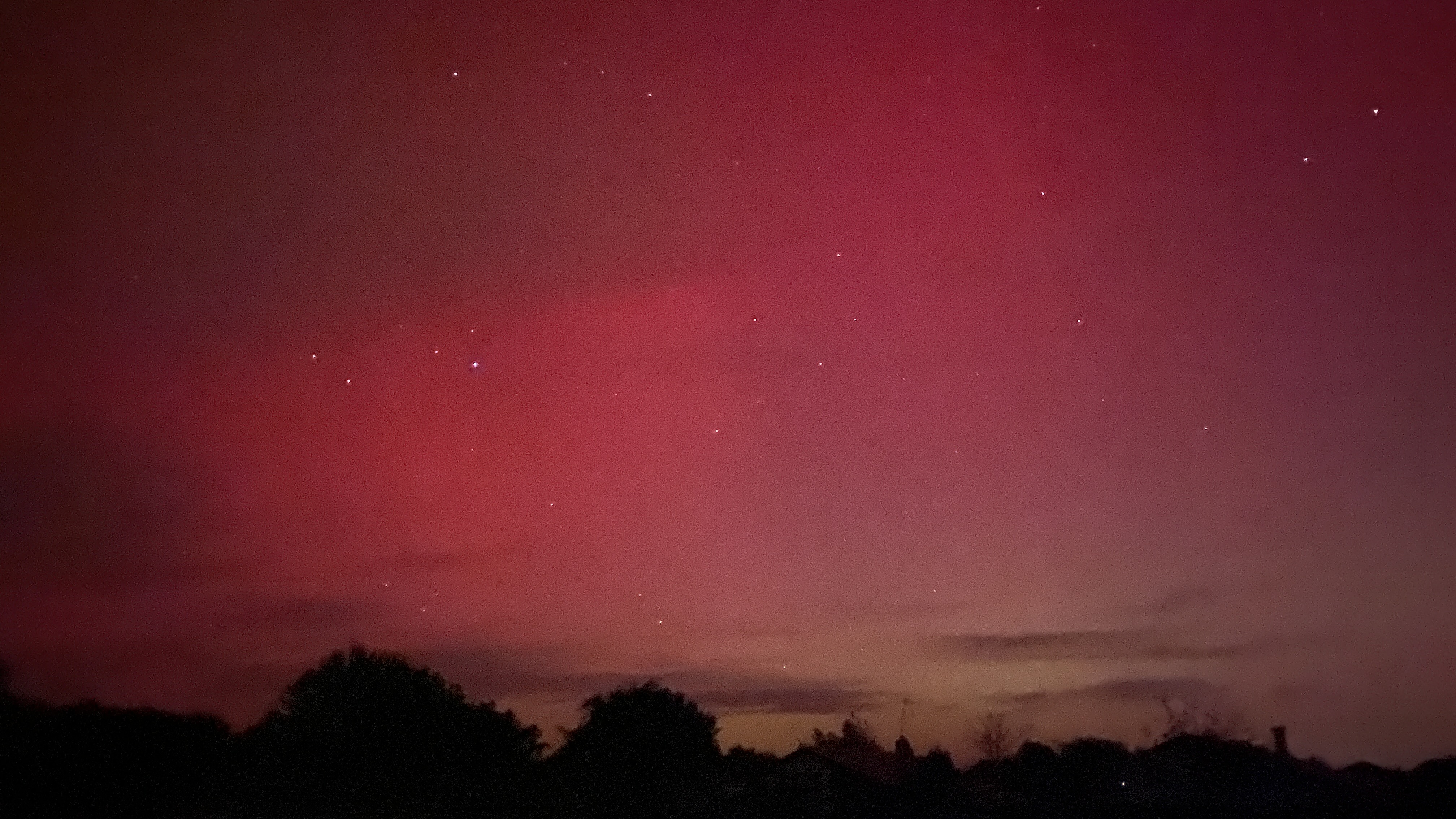 Couleur incroyablement intense, largement visible à l’œil nu mais peu de draperie contrairement à l’aurore du 11 mai dernier.