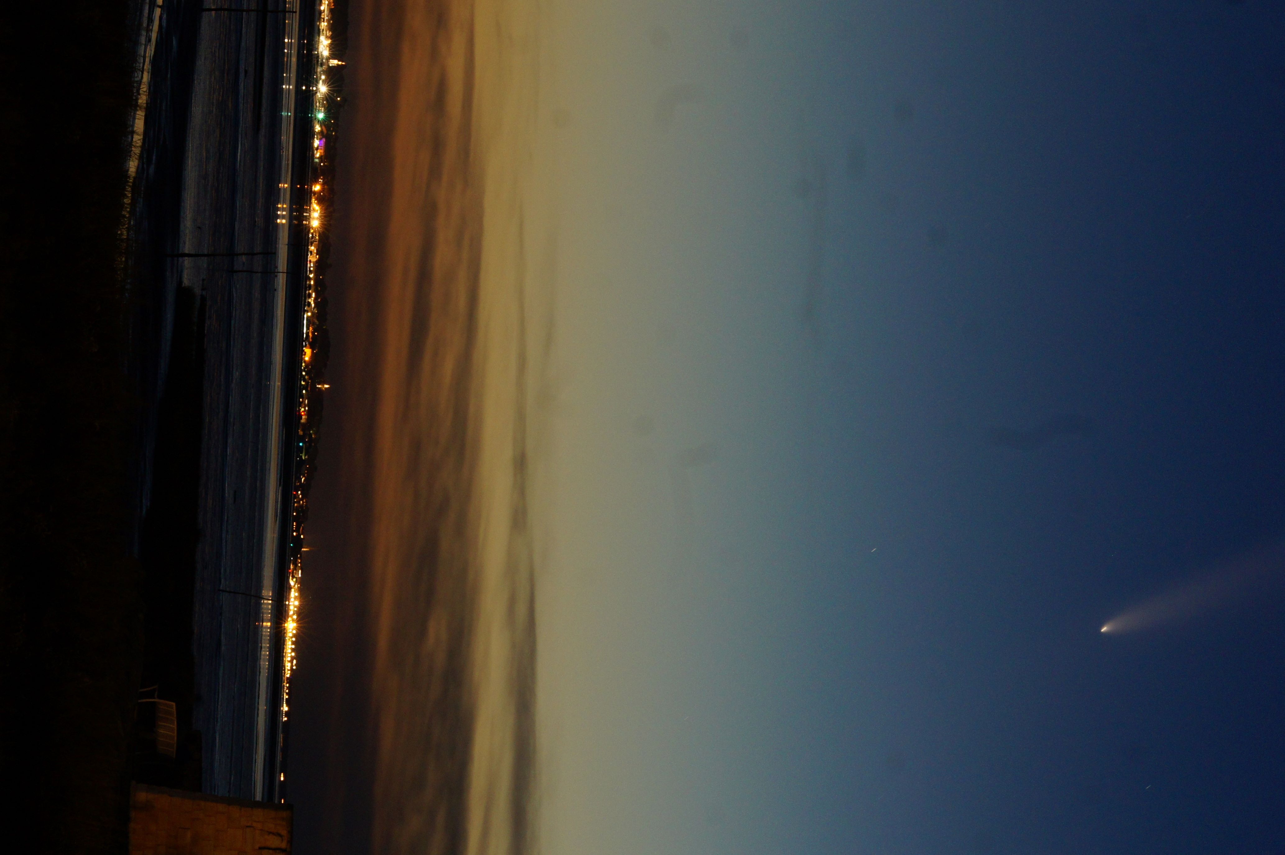 La comète Tsuchinshan-Atlas au-dessus d'Arcachon et des lueurs du couchant. Photo prise depuis le port d'Audenge. Appareil photo Sony A550 - téléobjectif 210mm - pose unique de 10 sec