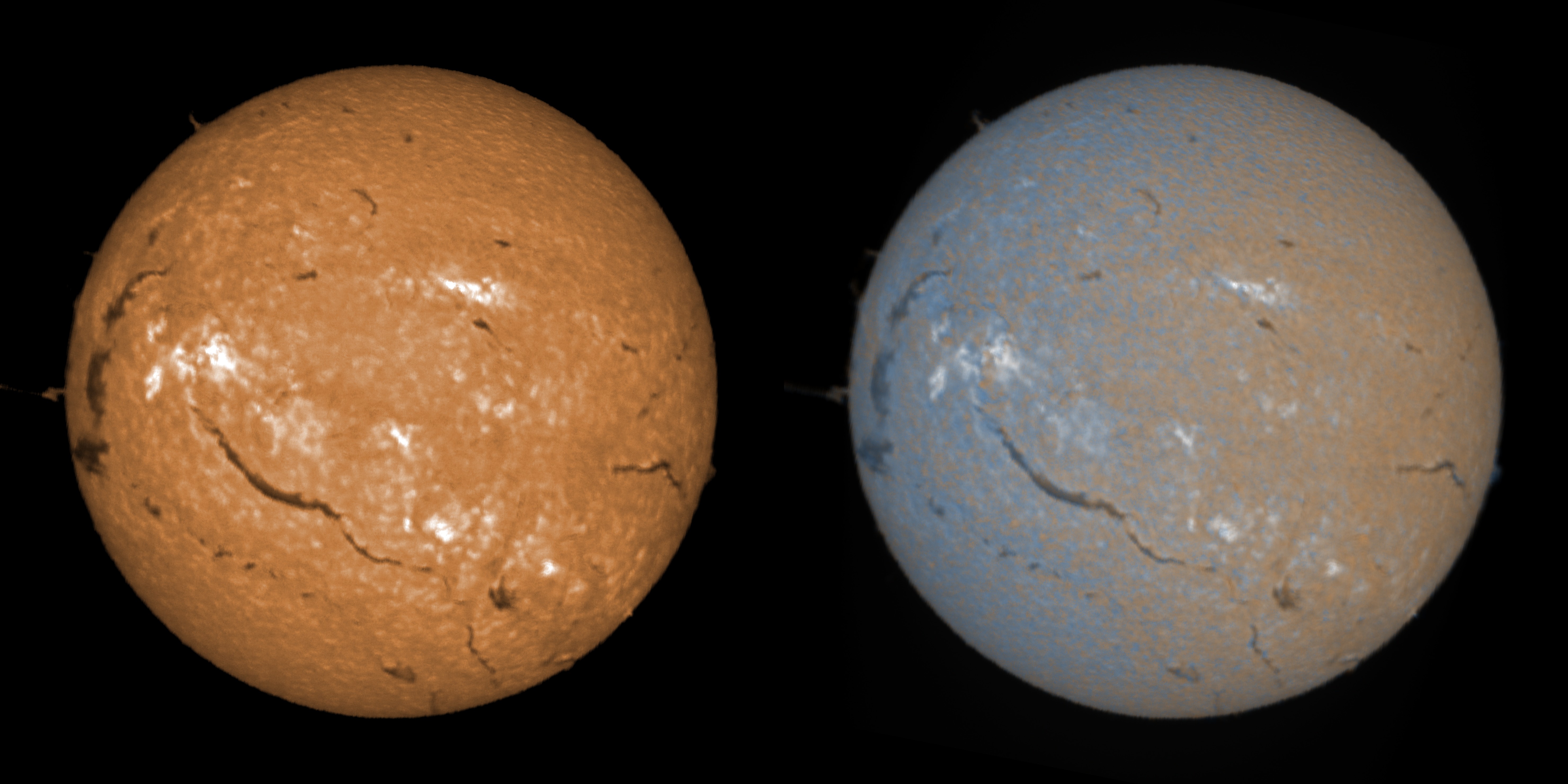A gauche, image de la chromosphère traitée en Hα par Jsolex et colorisée sous Gimp. A droite, l'image doppler permettant d'apprécier la rotation du soleil.