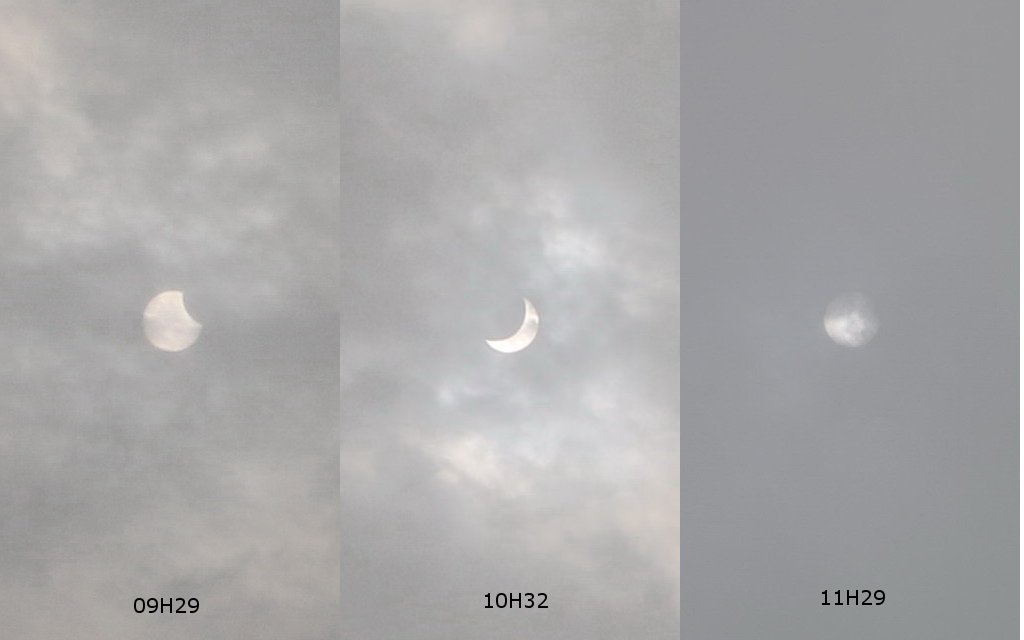 Le ciel était très couvert à Bordeaux, mais entre les nuages, parfois, le rendez-vous du Soleil est de la Lune programmé entre 9H14 et 11H30 était visible. Voici le montage de 3 photos en début, près du maximum (prévu à 10H20) et à la fin (un bord du Soleil est encore mangé par l'astre Sélène).