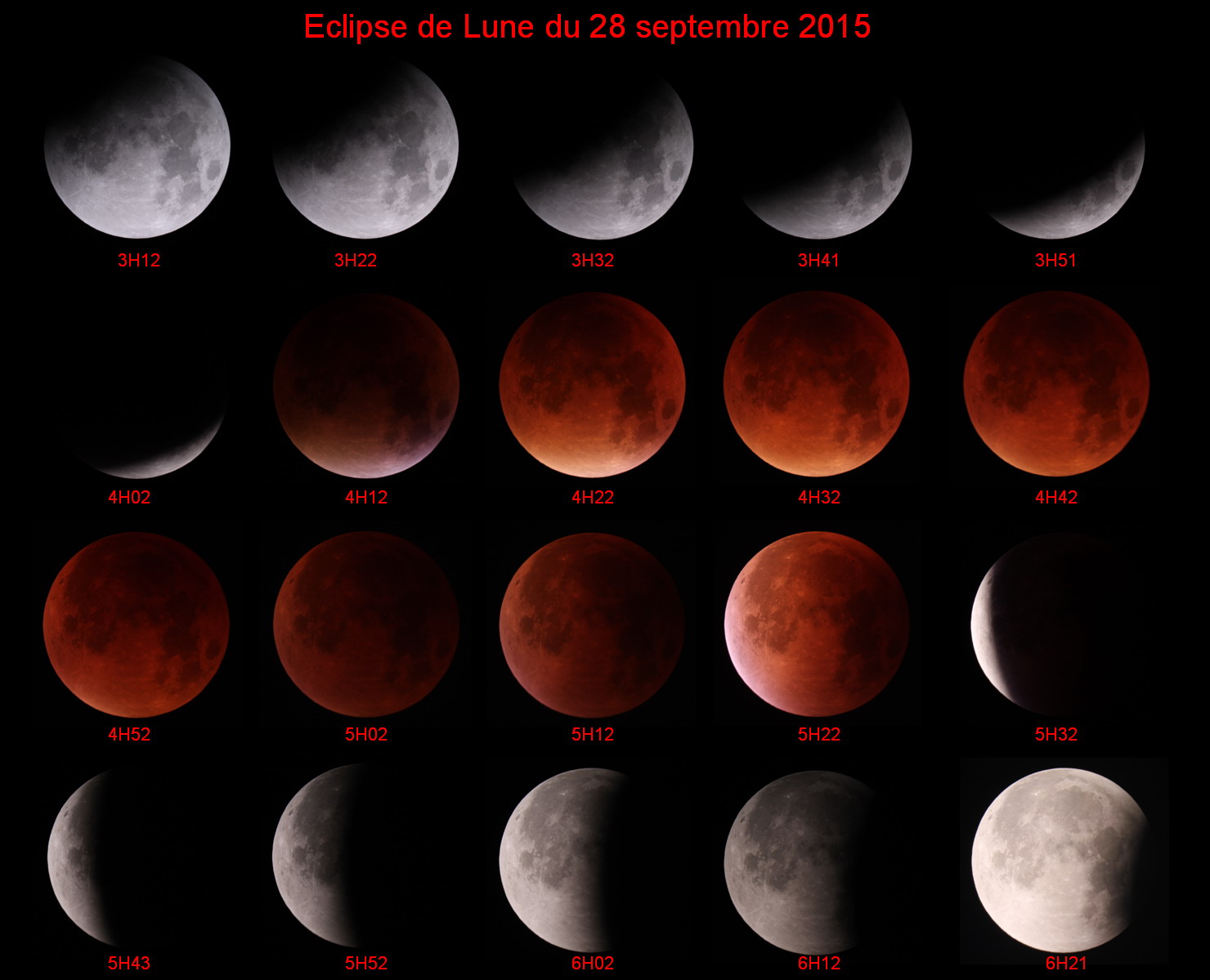 Montage de photos de l'éclipse de Lune avec un temps d'exposition variable (de 1/4000s à 1,3s pour la totalité) , le tout à 800iso, à raison d'une pose toutes les 10 minutes environ.