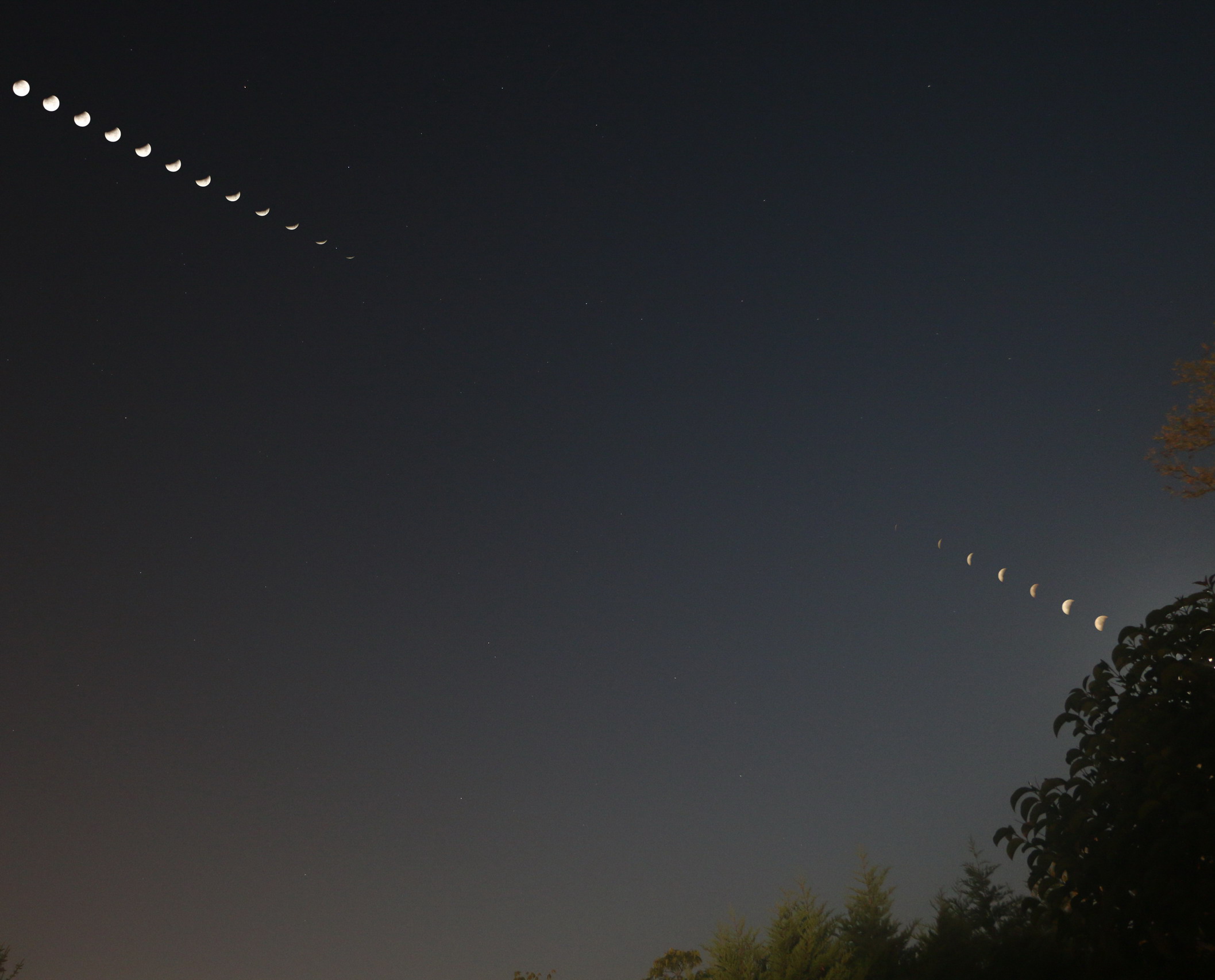 Montage de photos de l'éclipse de Lune avec un temps d'exposition constant de 1/1250s à 800iso, à raison d'une pose toutes les 5 minutes sur un EOS70D ouvert au maximum et une focale de 22mm.