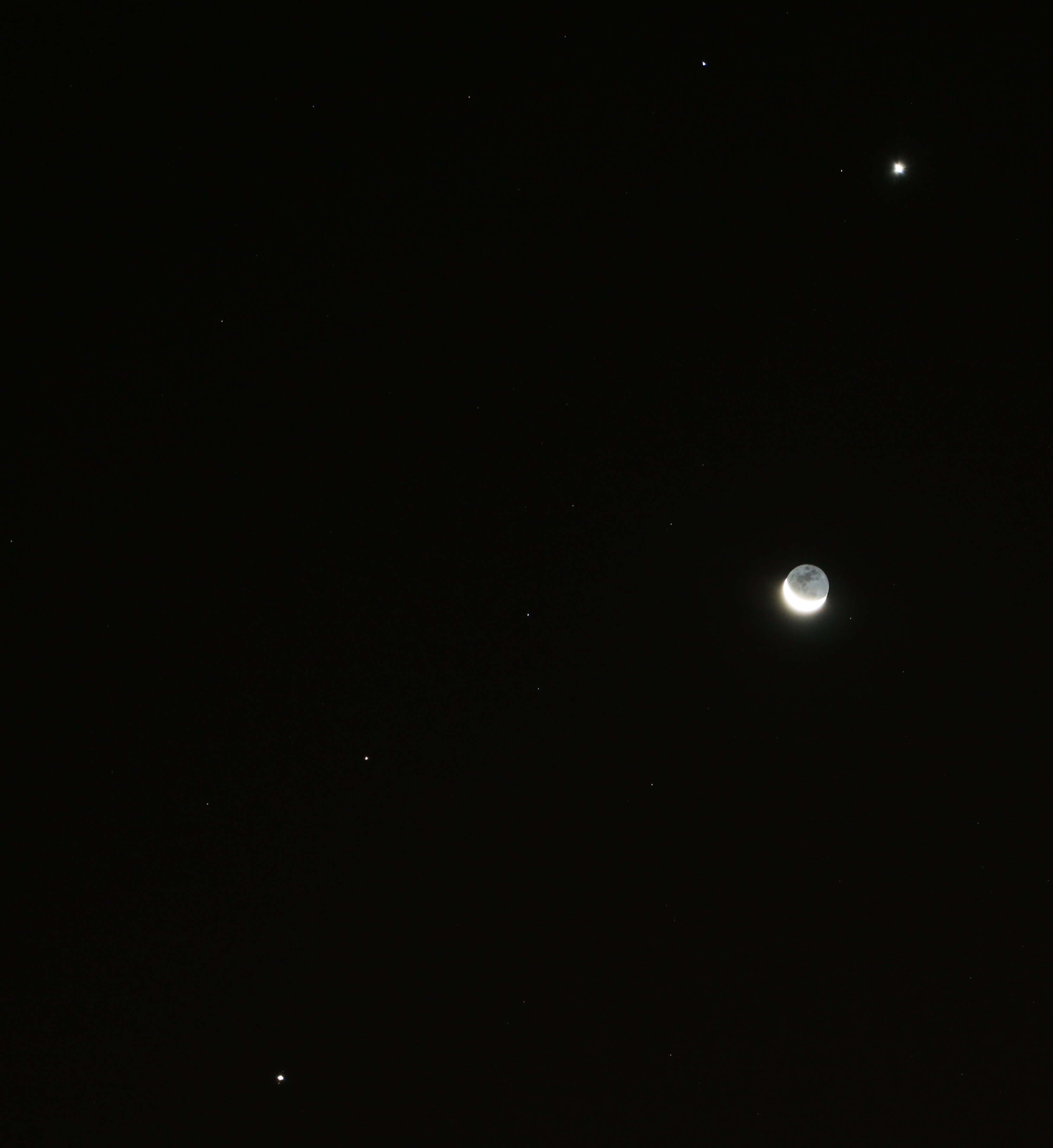 Au sud-est de Régulus située tout en haut, brille intensément Vénus, surplombant elle-même le dernier croissant de Lune. Mars rougeâtre et Jupiter avec ses satellites complètent plus bas cet extraordinaire rapprochement (apparent) dans un champ d'environ 13x12°.