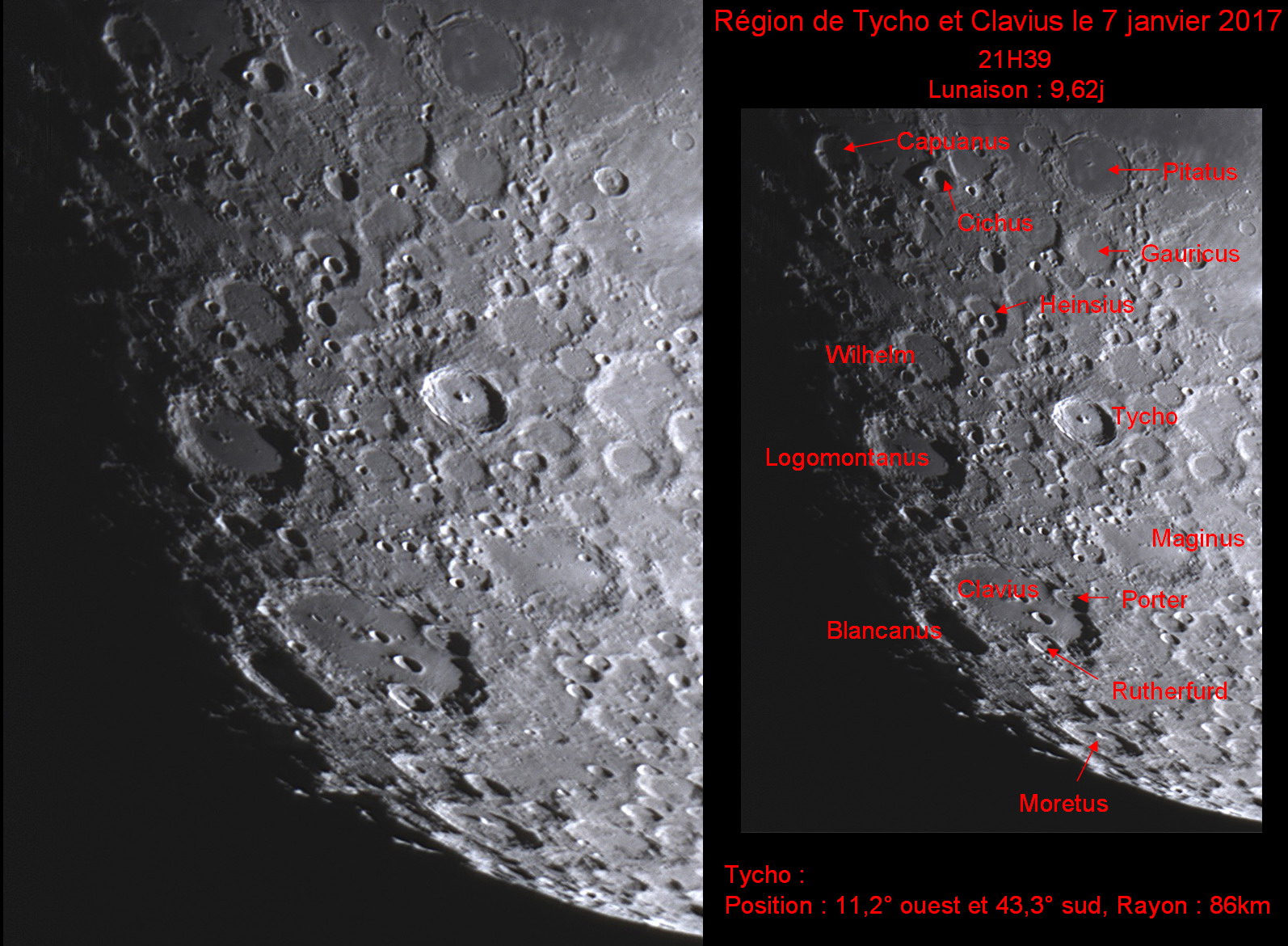 La région du cratère Tycho à 9,62 jours de lunaison, avec également les spectaculaires cratères Clavius ou Logomontanus...