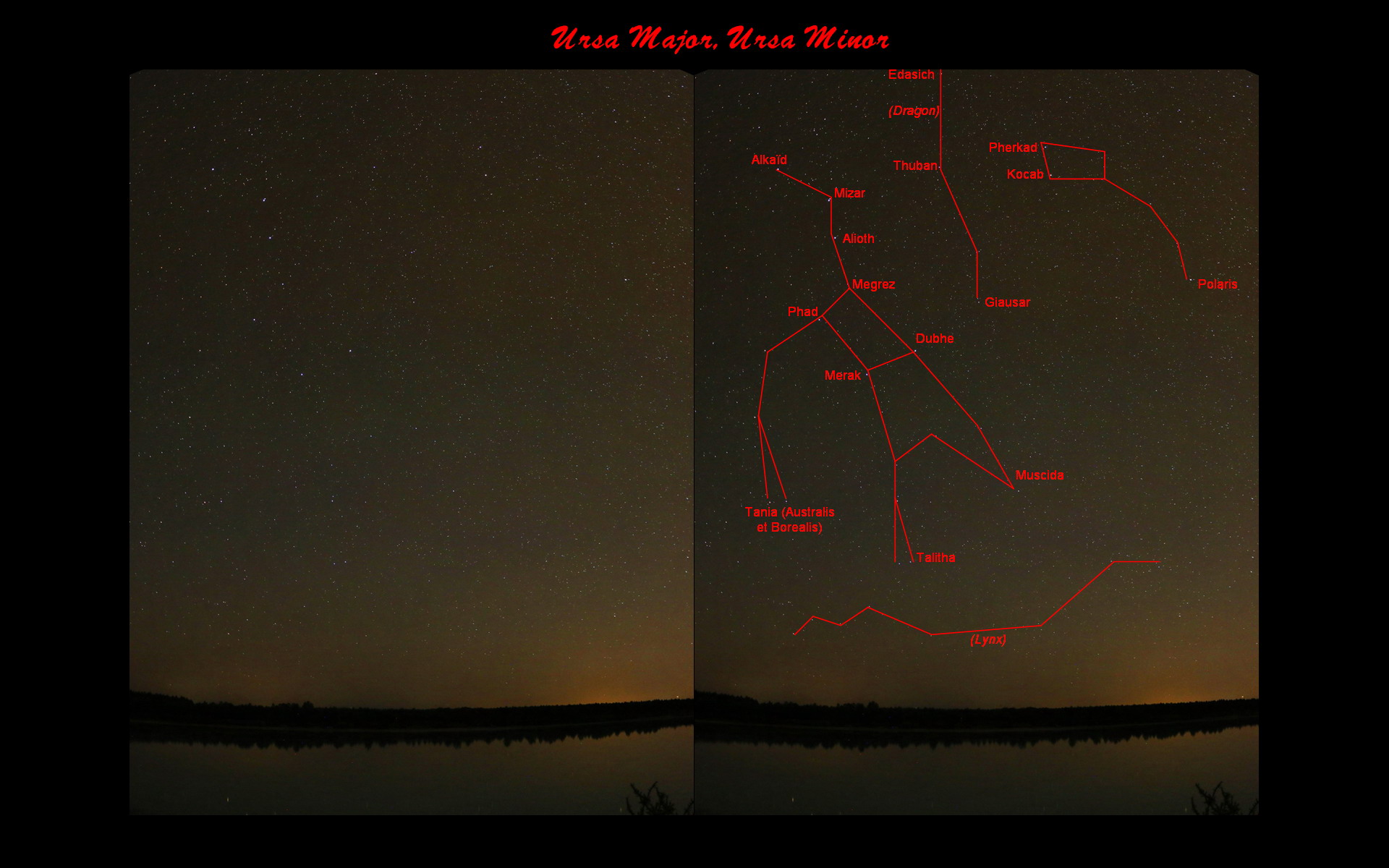 Voici les deux constellations circumpolaires bien connues Ursa Major et Ursa Minor sur un très grand champ permis par un montage panoramique d'environ 70°x70°.
