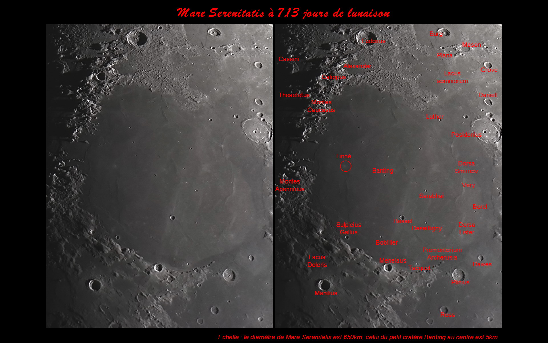 La mer de la Sérénité est à ce moment de la lunaison idéalement éclairée pour révéler ses moindres détails. Remarquez les nombreux dorsa et cratères au sein de cette "mer", les "lacs" au sud, zones plates dans un décor tourmenté, les montagnes (Caucases et Appennins) au nord-ouest jetant de spectaculaires ombres déchiquetées vers l'ouest.