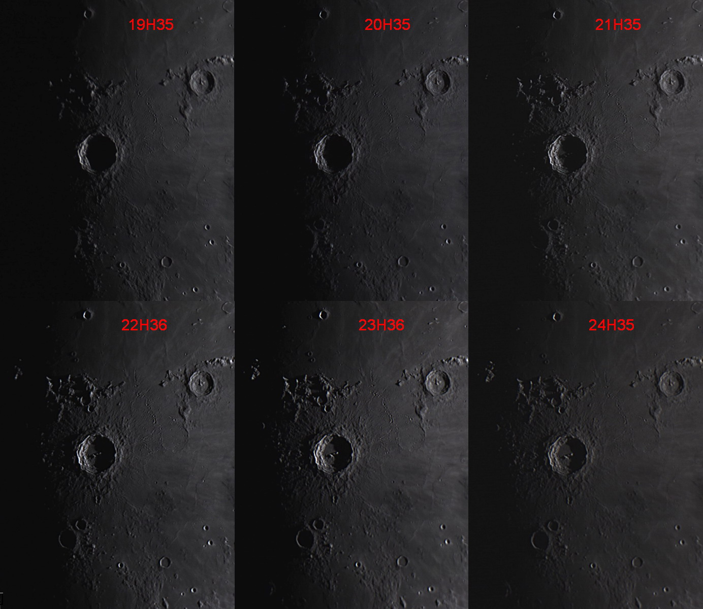 D'heure en heure sur 5 heures de temps, le lever du jour dans le cratère Copernic, avec l'apparition de ses majestueuses montagnes centrales, était un spectacle extraordinaire en ce 9ème jour de lunaison. Seul bémol, le seeing déplorable rendait tout grossissement supplémentaire infructueux.