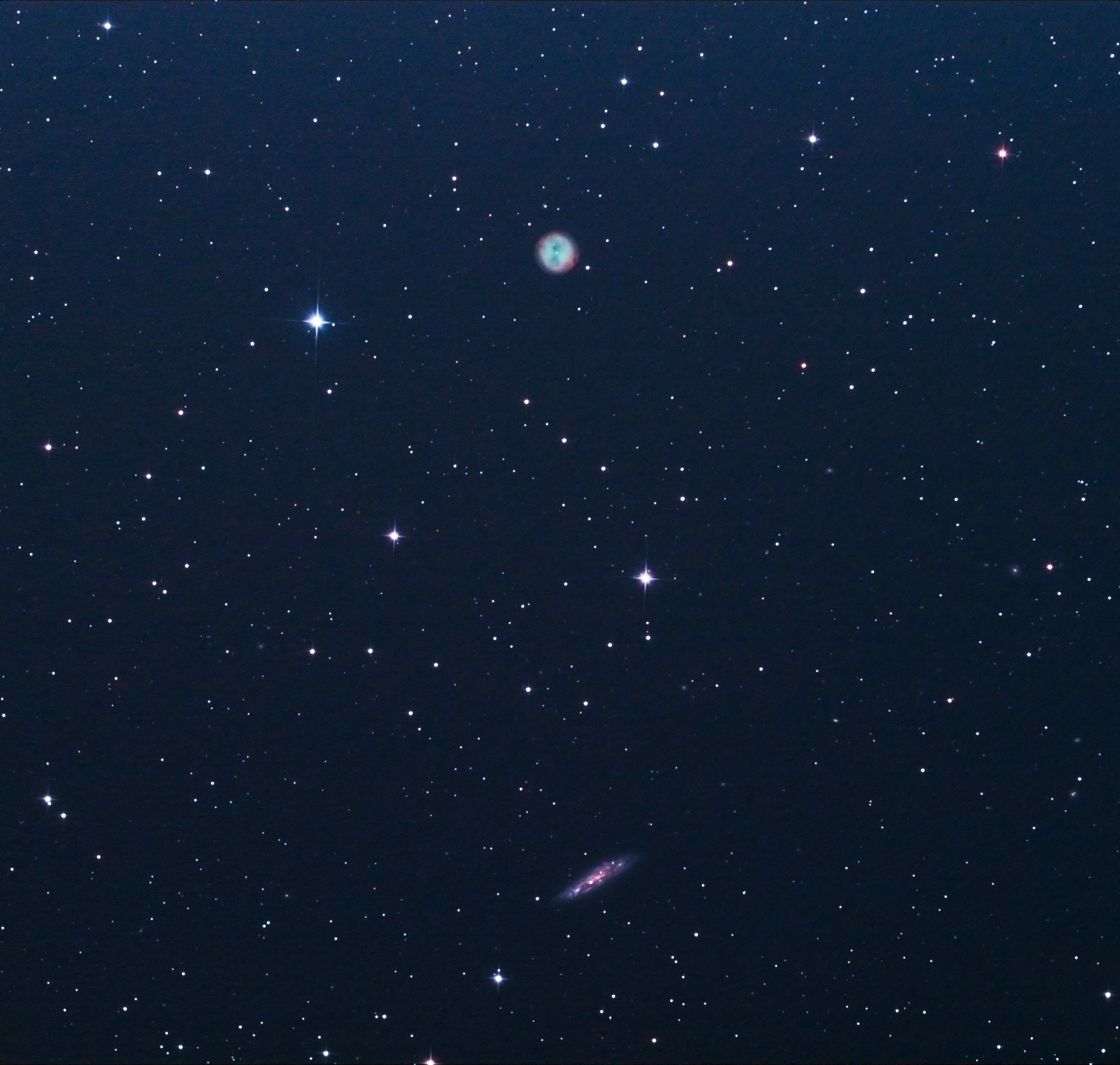 Situés à un peu plus de 2° de l'étoile Merak, bien connue car elle dépend du célèbre Grand Chariot (soit la partie la plus visible de la Grande Ourse) se trouvent visuellement proches une nébuleuse planétaire et une galaxie. La première est le reste d'une étoile qui a éjecté en fin de vie ses couches extérieures sous forme d'une coquille de gaz ici illuminée par le rayonnement violent de ce qu'il reste au centre, une naine blanche. La deuxième est une spirale apparemment sans bulbe et vue par la tranche de 125 milliards de masses solaires, membre de "l'amas de la Grande Ourse", petite partie du fameux "amas de galaxie de la Vierge"... Pour M97, nébuleuse surnommée "du Hibou" à cause des deux zones sombres plus pauvres en matière évoquant les yeux du prédateur, on appréciera le contraste avec M108. La nébuleuse est âgée d'environ 6000 ans et se situe à environ 2030 a.l. de nous, tandis que pour la galaxie, son âge se chiffre en milliards d'années et sa distance est 45 millions d'a.l., soit à peu près 22000 fois plus loin ! Et portant, visuellement, les deux objets ont des magnitudes et des dimensions apparentes proches, soit 11,2 et 3'12'' pour M97 et 10,1 et 8'18'' pour M108. Il aura fallu beaucoup de persévérance aux chercheurs du siècle passé pour confondre cette illusion par la mesure de la distance qui nous sépare de ces formations au fond si différentes...
