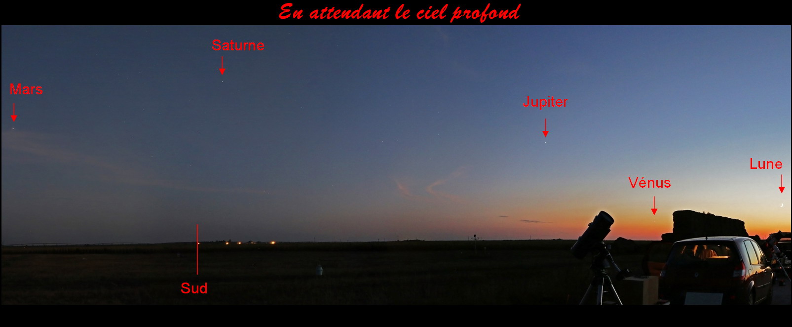 Septembre nous réserve encore de belles nuits pour l'astronomie, et dans l'attente du fourmillement d'étoiles de la voûte céleste, le spectacle saisissant des quatre planètes les plus visibles est encore à même de nous faire "patienter dans l'azur", dans une lente danse menée ce soir là par le fin croissant lunaire déjà plongé dans les lueurs du crépuscule.