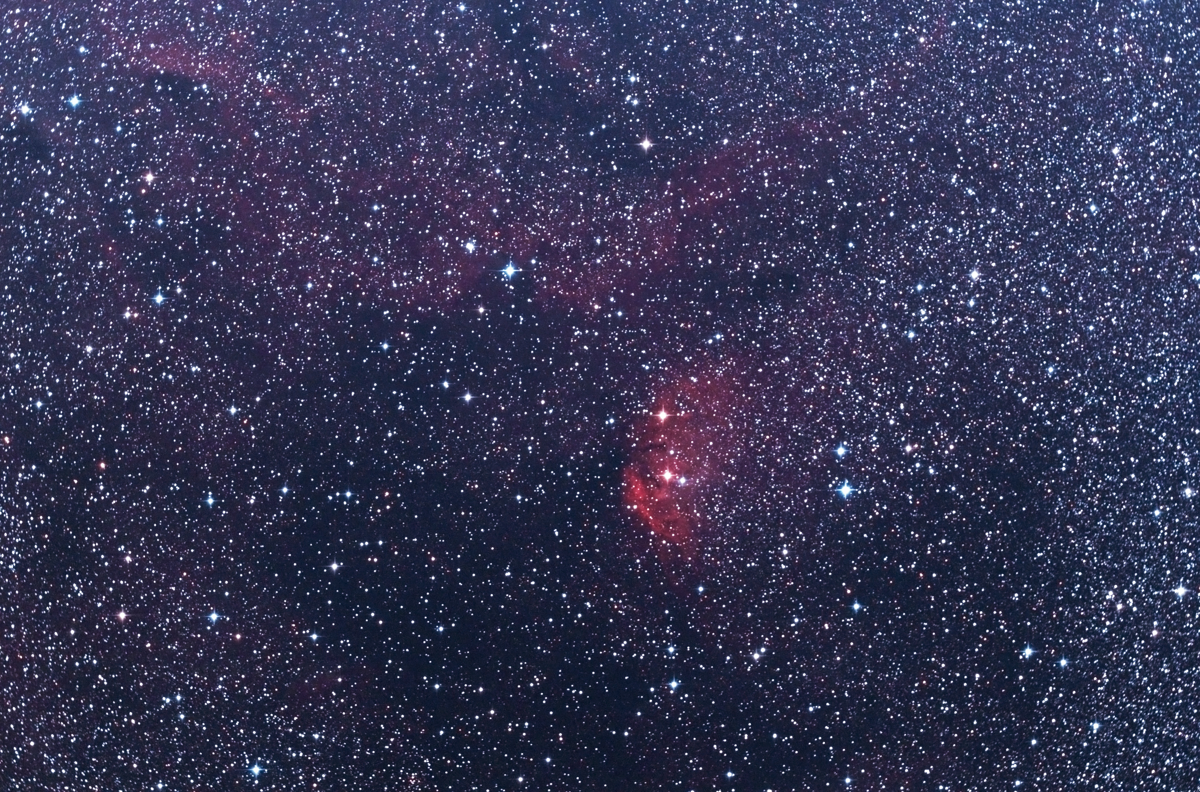 A environ 6000 a.l. de nous, une magnifique nébuleuse en émission, ou région H2, semble dessiner une délicate fleur écarlate parmi les myriades d'étoiles, les nuages sombres et de pâles lambeaux rougeâtres d'hydrogène de la voie lactée. De magnitude 9, cette pouponnière de jeunes étoiles exhibe d'ailleurs clairement comme la plupart des nébuleuses de cette famille des piliers de poussières sombres caractéristiques. Dans ce décor grandiose, on peut aussi s'attarder sur un objet bien particulier, en apparence voisin. C'est ici le sommet droit du triangle formé par les trois étoiles à aigrettes juste au sud de la nébuleuse. Ce point lumineux abrite une source X intense bien connue nommé "Cygnus X-1" qui s'avère être le premier trou noir confirmé, et l'un des plus étudiés. Sa magnitude de 8,9 provient du fait qu'il est en couple gravitationnel avec une étoile variable supergéante de 20 à 30 masses solaires située à 0,2 U.A. à peine, à laquelle il arrache sa matière dans une rotation effrénée de période 5,6 jours. Un festin d'hydrogène situé à environ 5600 a.l. de nous qui explique le délétère rayonnement X de ce trou noir de 14,8 masses solaires et signe ainsi sa présence...