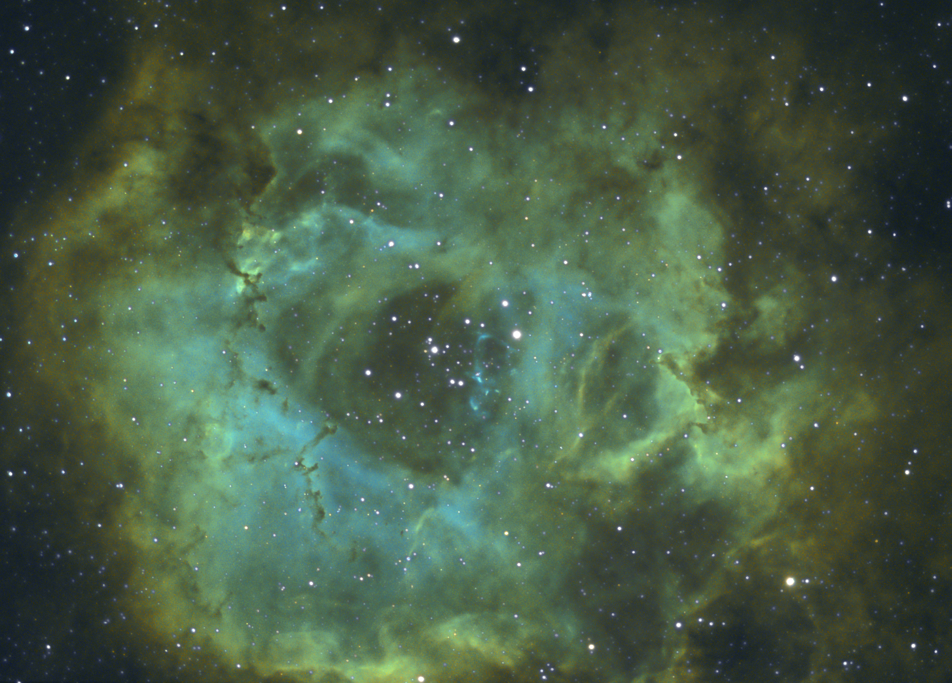 NGC 2237 en SII, H Alpha et OII, 11 poses de 4 mn avec camera ATIK314L+filtre Baader Ha,SII,OIII 7nm, lunette Fluorite de 80mm, site de Berganton