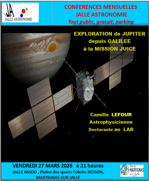 Dans le cadre des conférences mensuelles, JALLE ASTRONOMIE vous propose d’assister à sa prochaine conférence publique gratuite. « L’EXPLORATION de JUPITER, de GALILEE à la Mission JUICE » ». Nous vous attendons Salle MGDD, Plaine des sports Colette Besson, rue Louis Blanc à Martignas-sur-Jalle, le VENDREDI 27 mars 2026 à 21 heures.